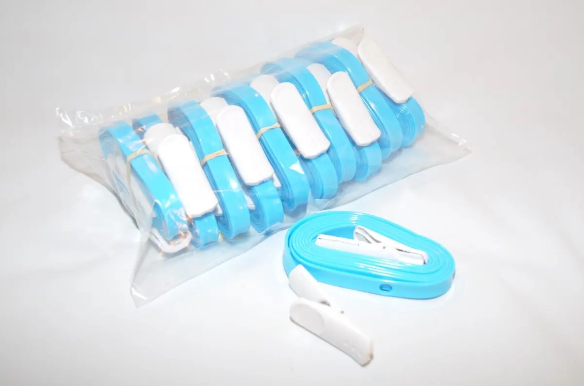 - Versatile Fittings: Sanipulls can be equipped with one or more handles (bangles) for easy grasping, which can be adjusted for height, replaced or removed by any layperson. Special spring clips can be attached to the lower end for fastening to bed linen or bed rails. The easily-grasped ribbon can also be used without fittings. Bangles are designed to be manipulated by any size of hand and in spite of most disabilities.